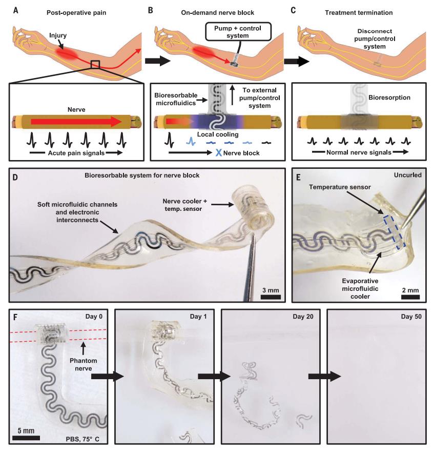 一款柔软的、可生物吸收的微流体装置能够在活体组织的任意深度通过实时温度反馈控制提供集中的、微创的冷却能力。水溶性、生物相容性材料的结构可导致溶解和生物再吸收,从而消除不必要的设备负荷和对患者造成的风险,而无需进行额外的手术。多周的体内试验证明了能够快速、精确地冷却周围神经,从而在大鼠模型中为神经性疼痛提供局部、按需镇痛。