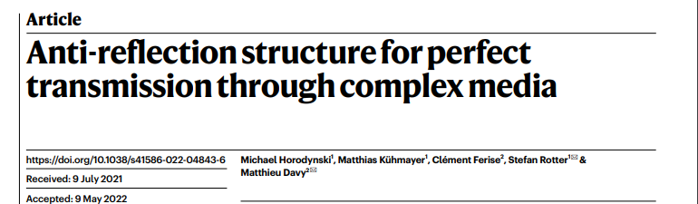 参考文献:Horodynski, M., Kühmayer, M., Ferise, C. et al. Anti-reflection structure for perfect transmission through complex media. Nature 607, 281–286 (2022).