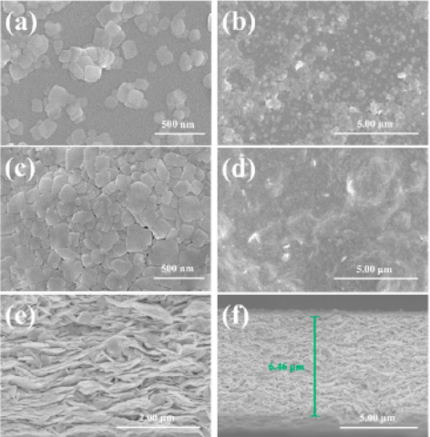 图3. (a, b)氯氧化铋纳米片和(c, d)氯氧化铋膜的SEM图像;(e, f)氯氧化铋膜的截面SEM图像