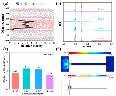 图4. (a)二维纳米通道内水分子的相对密度分布,以通道直径为2.95 nm的分子动力学模拟快照为背景;(b)不同直径氯氧化铋纳米通道中水分子氧原子间的径向分布函数;(c)水分子在不同直径纳米通道中的扩散系数;(d)有限元模拟毛细力诱导的传质过程,在直径为2.95 nm的通道中,高速对应水流入口和压力分布