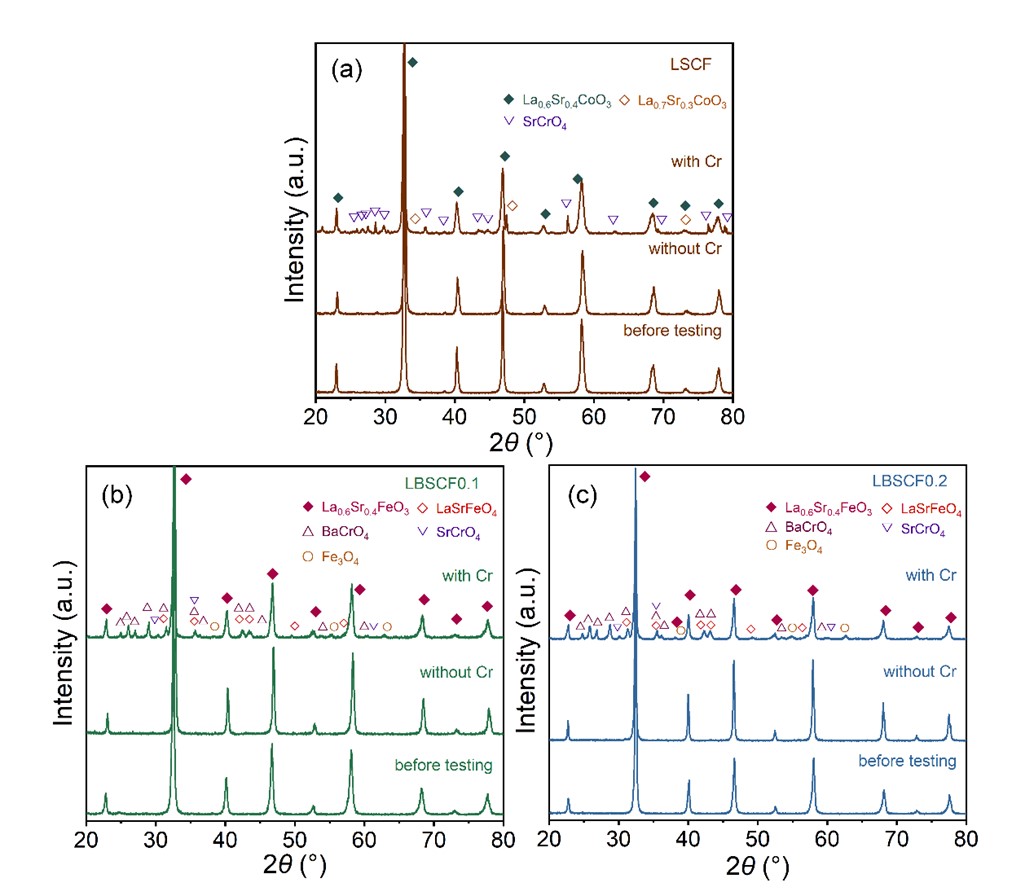 2、Ba掺杂LSCF阴极性能优异的重要原因是降低了LSCF晶格中Sr损耗和较少的第二相沉积。