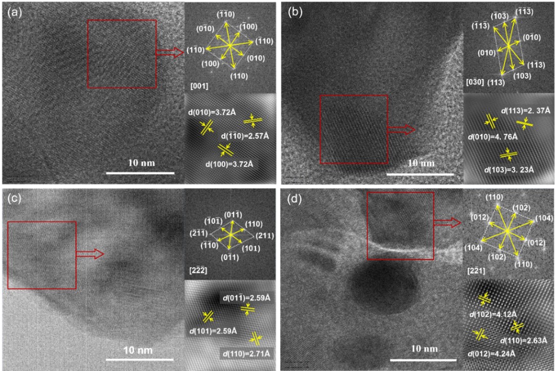 在800℃下测试120h后,对LSCF和LBSCF0.2阴极样品进行TEM分析。在没有Cr暴露LSCF (a)和LBSCF0.2 (b)阴极的选定区域的HRTEM、FFT和IFTT图像;经过Cr暴露测试的LSCF (c)和LBSCF0.2 (d)阴极选定区域的HRTEM、FFT和IFTT图像。