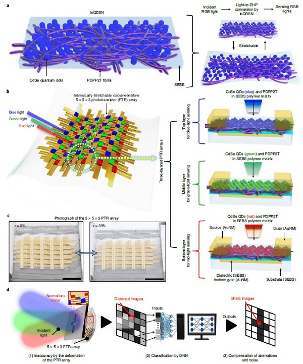 有鉴于此,韩国基础科学研究所Donghee Son、Dae-Hyeong Kim和Taeghwan Hyeon(共同通讯作者)等人提出了一种合理的材料设计和简单的器件制造策略,基于量子点半导体纳米复合材料(isQDSN)可实现可拉伸、多光谱和多路复用的光电晶体管阵列,同时,所制造的光电晶体管还展现出了颜色敏感和形状可调特点。具体来说,isQDSN由有机半导体聚合物、尺寸可调量子点和弹性基体组成,由于表面能失配, isQDSN内形成了独特的量子点空间分布,实现了高光敏特性。此外,通过采用深度神经网络(DNN)算法,研究还解决了与形状调谐多路光电晶体管阵列的光学像差和噪声相关的关键挑战。实验显示,此类多路复用光电晶体管阵列不管在其平坦或者变形状态下均能精确检测红色/绿色/蓝色图案,展现出了极具前景的光电探测应用。韩国基础科学研究所Jun-Kyul Song、Junhee Kim、Ja Hoon Koo和成均馆大学Jiyong Yoon为本文共同第一作者,研究成果以 “Stretchable colour-sensitive quantum dot nanocomposites for shape-tunable multiplexed phototransistor arrays”为题发表在国际著名期刊Nature Nanotechnology上。