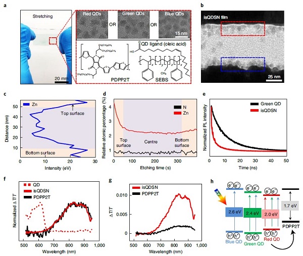 (a)贴在SEBS处理基板上的拉伸isQDSN膜的照片(50%拉伸,左图)。右上角的图片显示了isQDSN的成分,即带有油酸配体的红色、绿色和蓝色量子点的透射电子显微镜图像(上图)以及PDPP2T和SEBS的分子结构(下图)。;