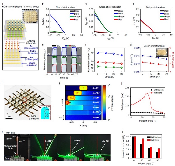 (h)与可变形透镜阵列集成的光电晶体管阵列;