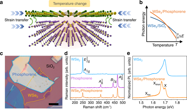 (a)单层WSe2作为应变计探测顶层磷烯层的热形变。