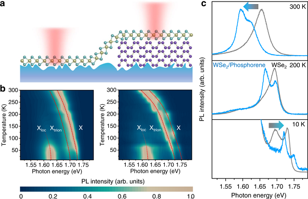 (b)从10到300 K,中性激子(X)、带电的激子(Xtrion)和局部激子(Xloc)在SiO2底物上分离的WSe2和WSe2/磷烯异质结的PL。