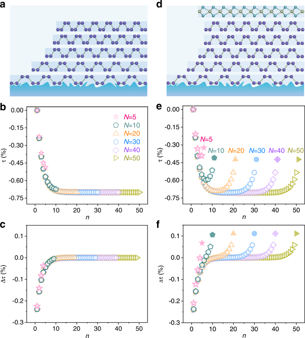 (b-c)N = 5、10、20、30、40和50时磷烯/SiO2系统中理论计算层数依赖的τ和∆τ。