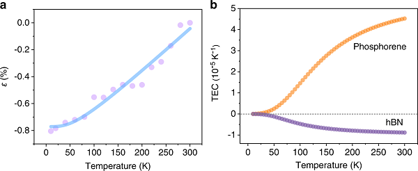 (b)磷烯和hBN的温度依赖热膨胀系数(TEC)。