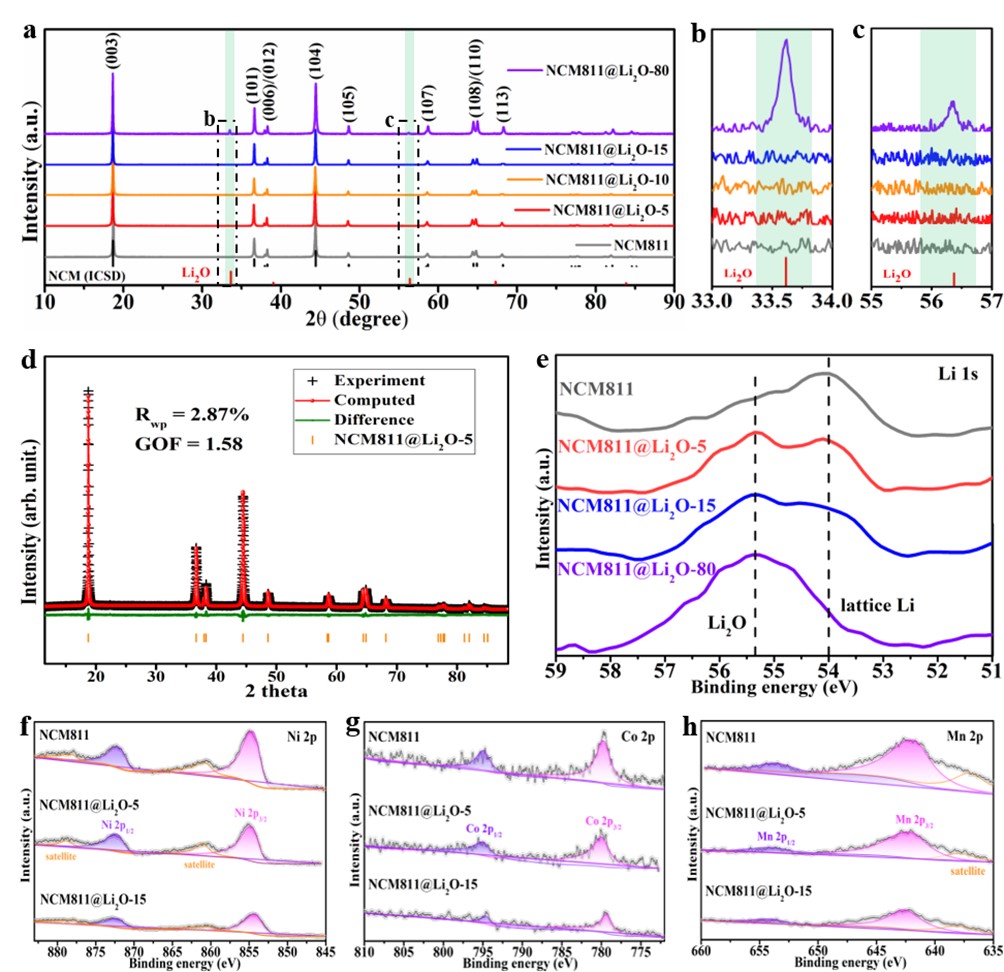 图3. 材料的物相及表面化学态的表征。(a-c)NCM811和NCM811@Li2O-P (P=5, 10, 15, 80)样品的XRD图;(d)NCM811@Li2O-5样品的XRD-Rietveld精修图;NCM811@Li2O- P (P=5, 15, 80)样品的XPS谱图:(e)Li 1s;(f)Ni 2p;(g)Co 2p和(h)Mn 2p。