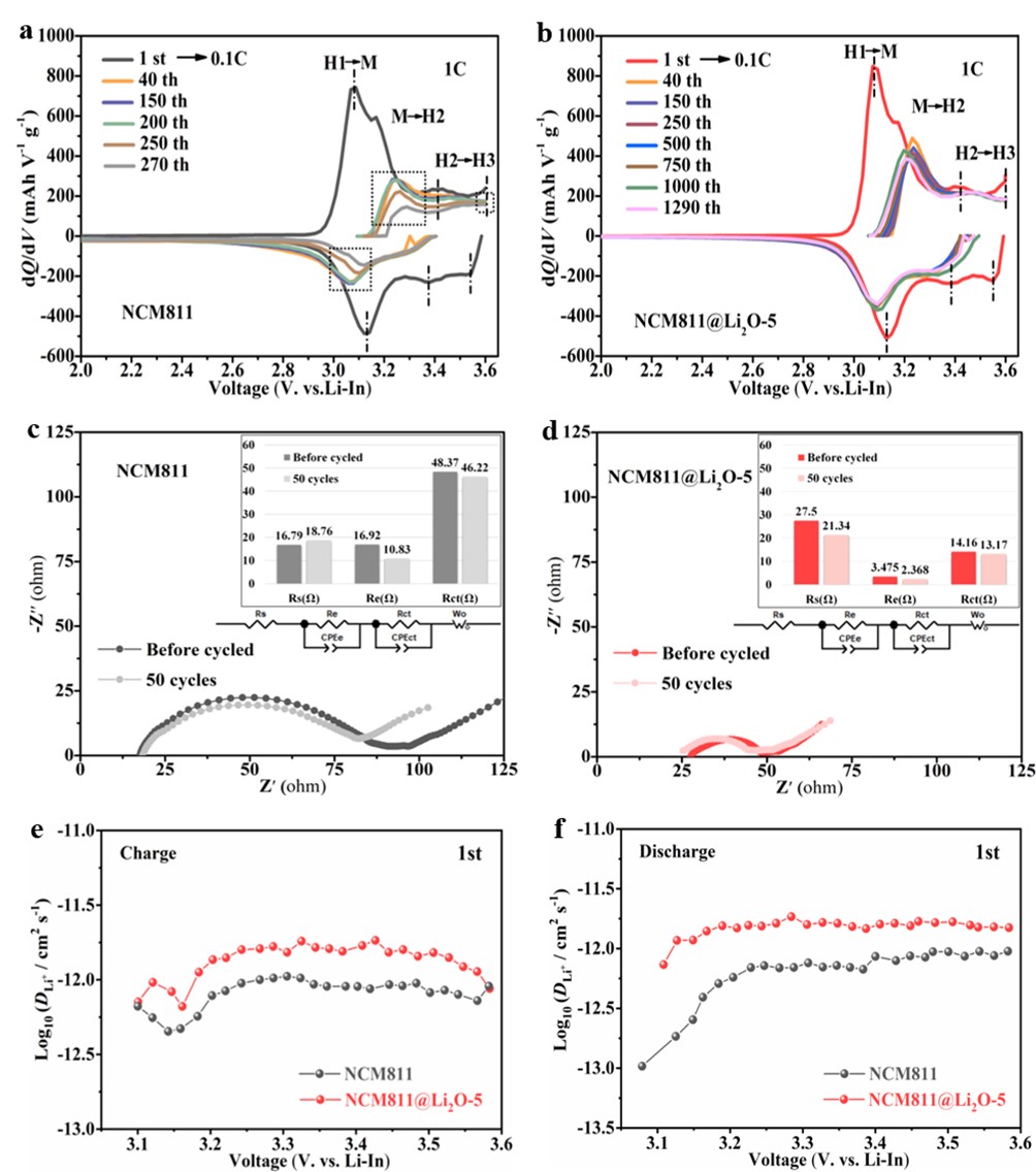 图5. NCM811和NCM811@Li2O-5 电极的电化学分析图。(a,b)dQ/dV图;(c,d)循环前后的EIS图;(e,f)首圈充放电过程的GITT图。