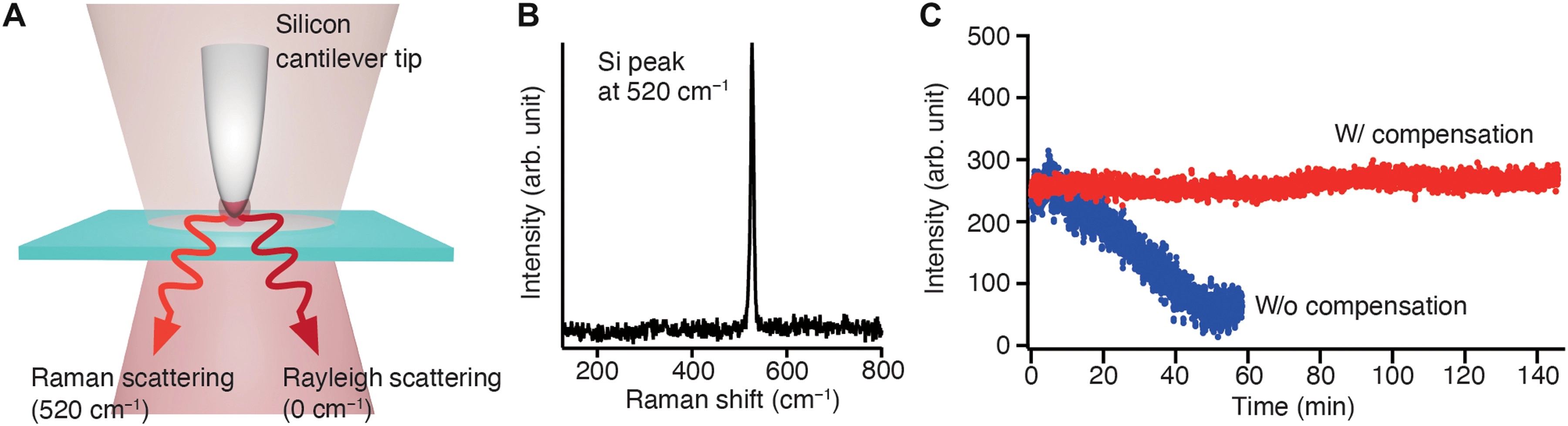C. 用3D漂移校正系统测量了520 cm−1处硅峰的拉曼强度随时间的变化150分钟,在没有任何漂移补偿的情况下测量了60分钟
