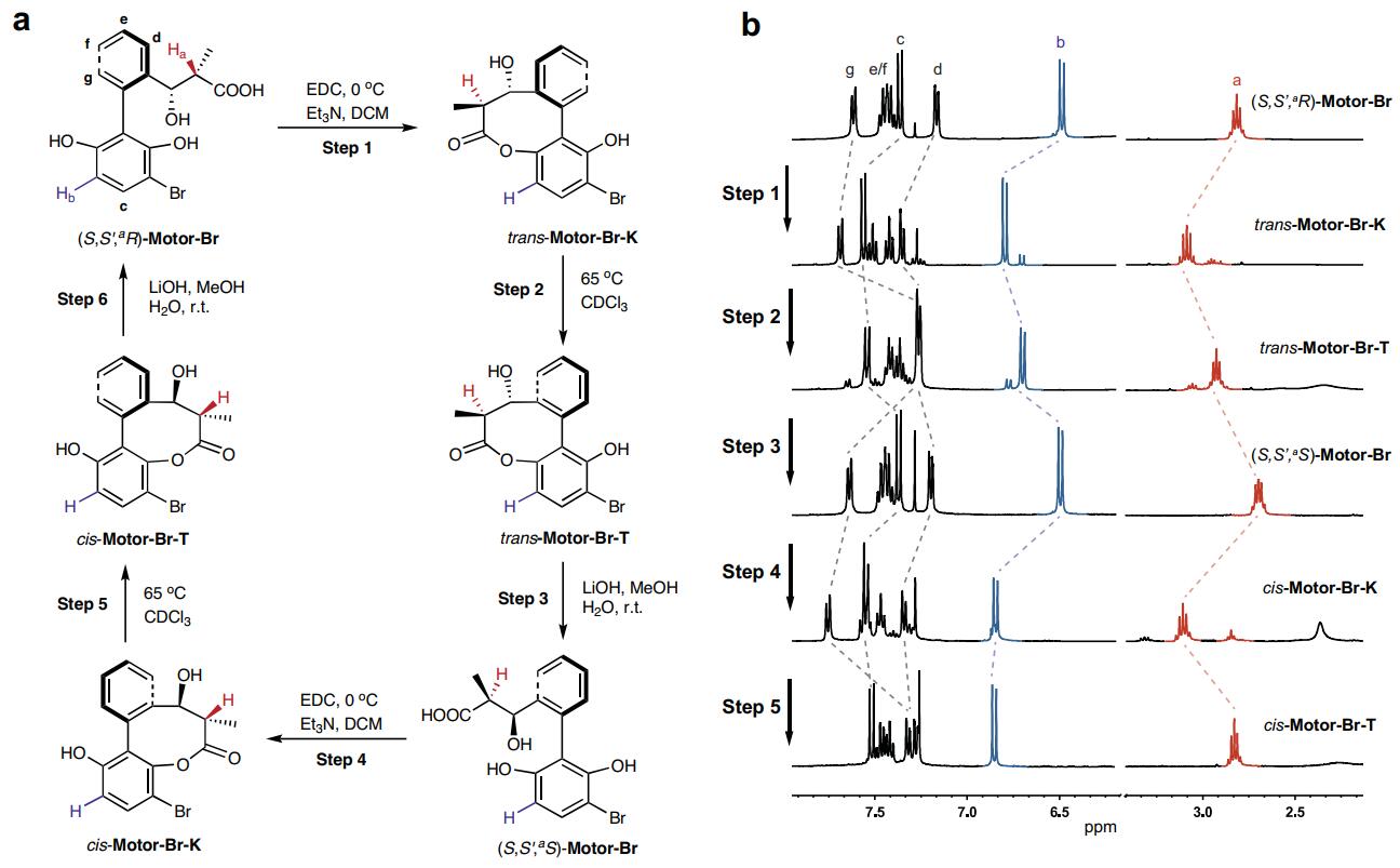 图2. 通过降低定子的不对称性来验证分子马达的单向360°旋转:a. Motor-Br 360°旋转的六个步骤;b. 六种异构体的部分1H 核磁共振光谱 ©2022 Springer Nature