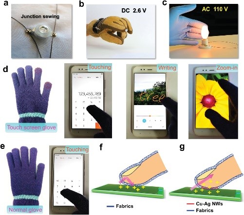 图4 用于可穿戴衣服上LED照明的导电线的a)光学图像、b)手套以及c)灯泡电路; d) Cu-Ag纳米材料制作的触摸屏手套的光学图像,分别用于操作智能手机的触摸、书写和放大; e)正常手套无法正常操作智能手机; f)普通手套和g)触摸屏手套工作原理示意图。