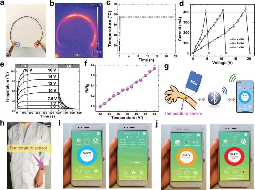 图5 铜银纳米网制成的环形加热器a)照片和b)红外热成像图; c) 不同保载时间下加热环的温度演化; d)不同电压下电流随导线长度演化; e)不同电压下导电丝线包覆的Cu-Ag纳米网温度分布随时间演化; f)不同温度下温度传感器相对电阻演化; g)温度传感器工作示意图; h)在手臂上放置温度传感器; i,j)不同体温下的监测用户的实时智能手机界面。