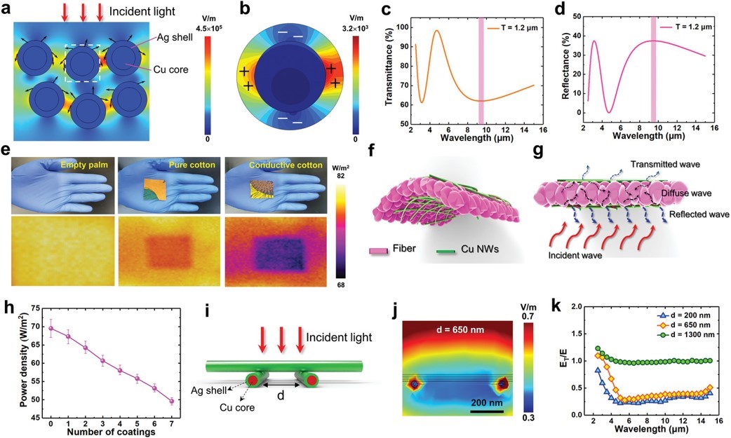 图6 a) Cu-Ag纳米网的电场分布; b) a)图中选定区域的放大成像; 纳米材料c)透射率和d)反射率; e)徒手、纯棉织物照片和纳米材料的照片和红外成像; f)导电织物原理示意图; g) 导电织物红外反射示意图; h)功率密度随包裹数演化; i)交叉纳米网结构模型; j)纳米网横向电场分布; k) 不同NWs距离下纳米网相对透射变化。