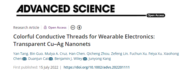 近日,厦门大学Yan Tang等研究人员制备了Cu-Ag纳米网,基于独特的工艺流程,使Cu-Ag纳米网包裹在丝线纤维上,不仅保留了其固有属性,而且显著改善其导电能力、稳定性和干洗耐久性。在此基础上研究开发出一系列高质量、彩色的电子纺织设备。该研究成果以“Colorful Conductive Threads for Wearable Electronics: Transparent Cu–Ag Nanonets”为题发表在Advanced Science上。