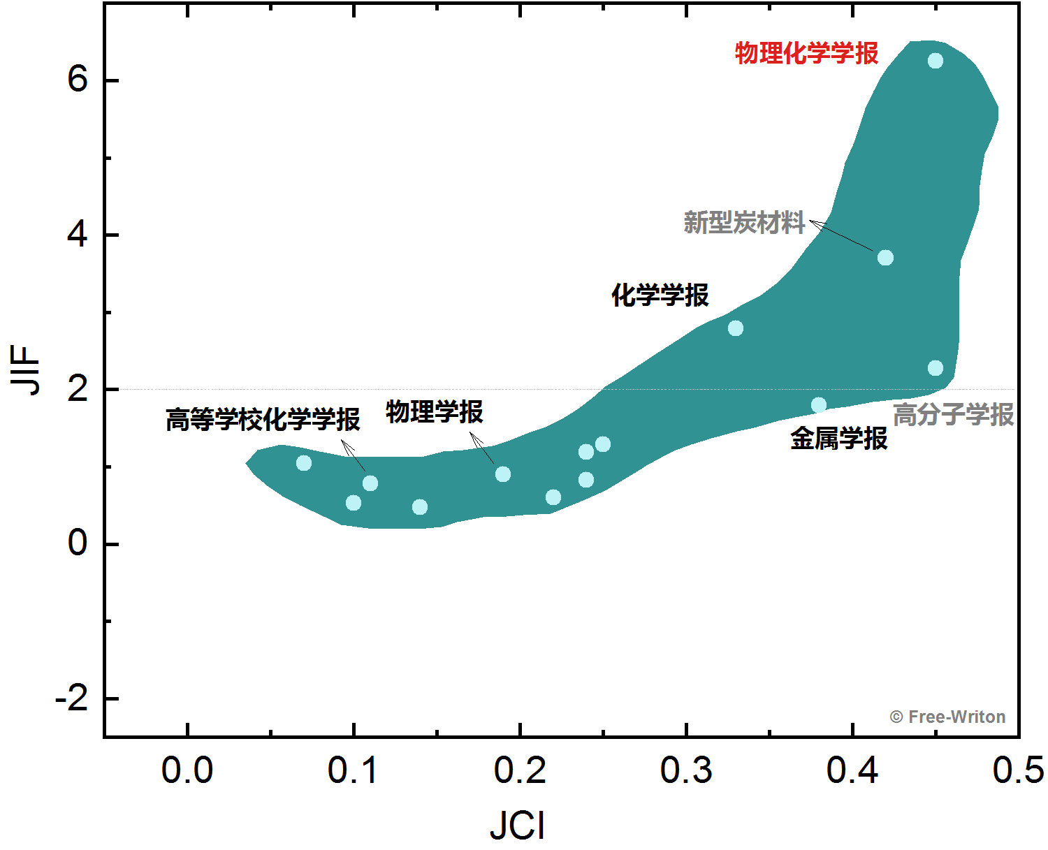 不过,别急, 当我们对比JCI分值时,出现了巨大变化,JPCL为1.22,《物理化学学报》仅为0.45,前者为后者的2.7倍!因此,从论文的平均引文影响力来看,JPCL依旧是物化界的顶流。