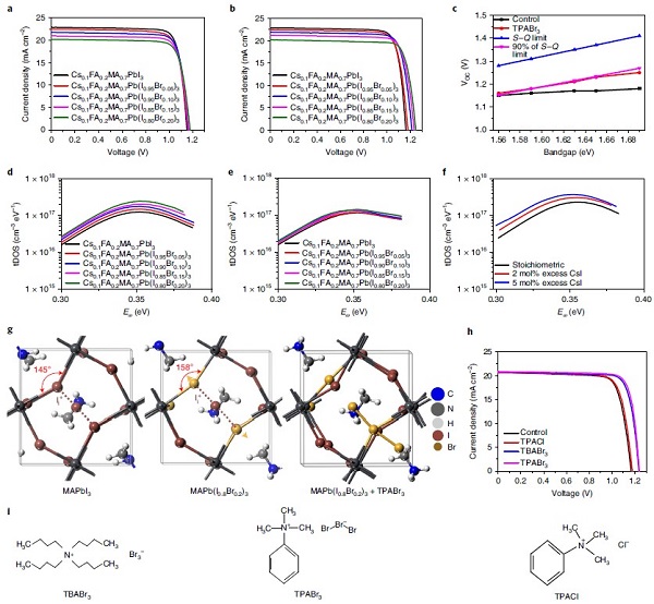 (h)通过含有TPABr3, TBABr3 或 TPACl添加物的前驱体溶液加工处理得到的Cs0.1FA0.2MA0.7Pb(I0.85Br0.15)3太阳能电池的J–V曲线;