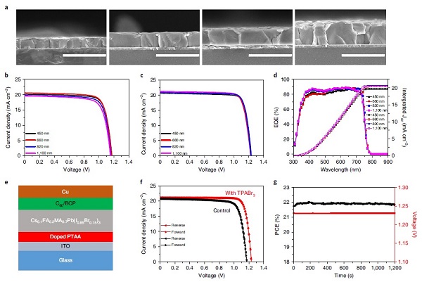 (f)表现最佳的对照组器件与TPABr3含量为 0.2 mol%的Cs0.1FA0.2MA0.7Pb(I0.85Br0.15)3器件的J–V曲线;