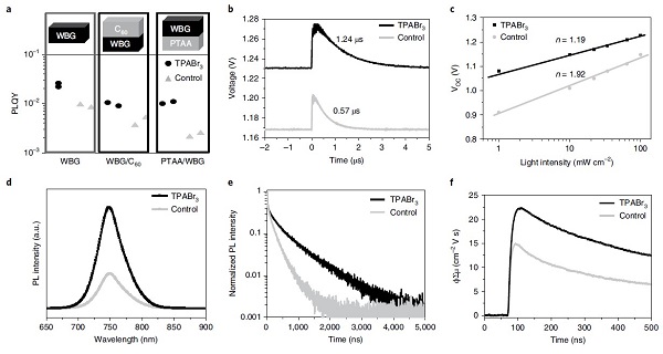 (c)对照和TPABr3器件中与带隙相关的VOC;
