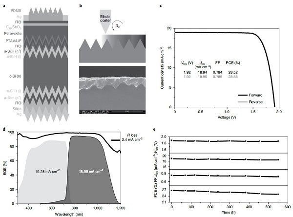 图四、钙钛矿–晶硅叠层电池的效率和稳定性