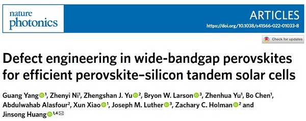 文献链接:Defect engineering in wide-bandgap perovskites for efficient perovskite–silicon tandem solar cells, Nat. Photonics, 2022, DOI: 10.1038/s41566-022-01033-8.
