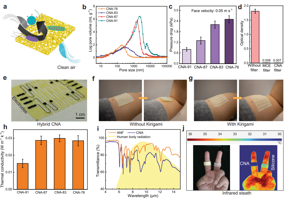 图4 潜在的应用。a,用作空气过滤器的CNA膜的示意图。b不同孔隙度CNAs的孔径分布。c,面部速度为0.05 m s−1时,20 μ m厚的CNA膜上的气压降。d,与商业MCE膜相比,CNA膜对空气中细菌的过滤效率。600 nm波长处的光密度(OD600)与电池浓度成正比。e, kirigami CNA膜具有导电油墨的图案,渗透到多孔结构中,用作可穿戴电子设备的电极和互连。f, g, kirigami型CNA膜在人体皮肤动态三维表面上的整合性(g)与无kirigami型CNA膜相比(f)。h,不同孔隙度的CNA的热导率。i, CNA和纯ANF的红外透过率光谱,与人体辐射光谱进行比较。j,照片和红外热图像显示了与硅橡胶相比的CNA膜的热隐身行为。