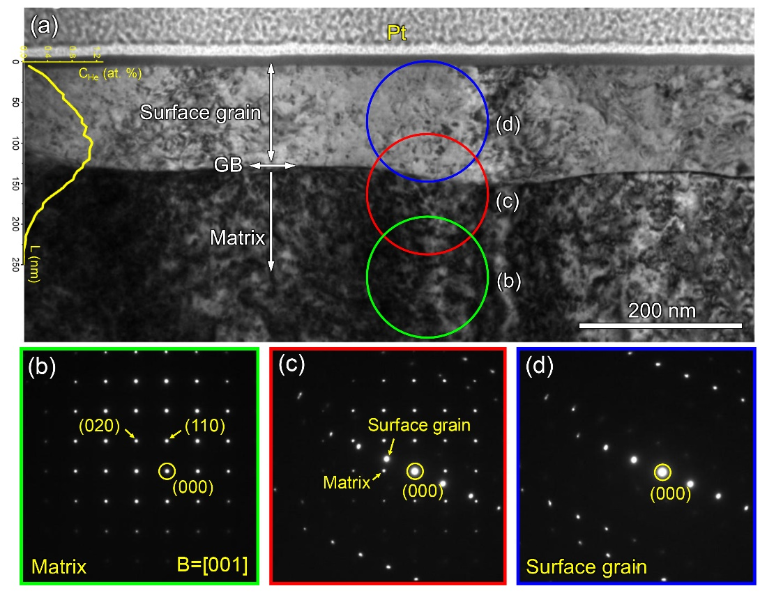 图2. W {110} 中辐照诱导的表面晶粒。(a)表面晶粒的透射电镜图。(b-d)基体、界面、以及表面晶粒的衍射花样。