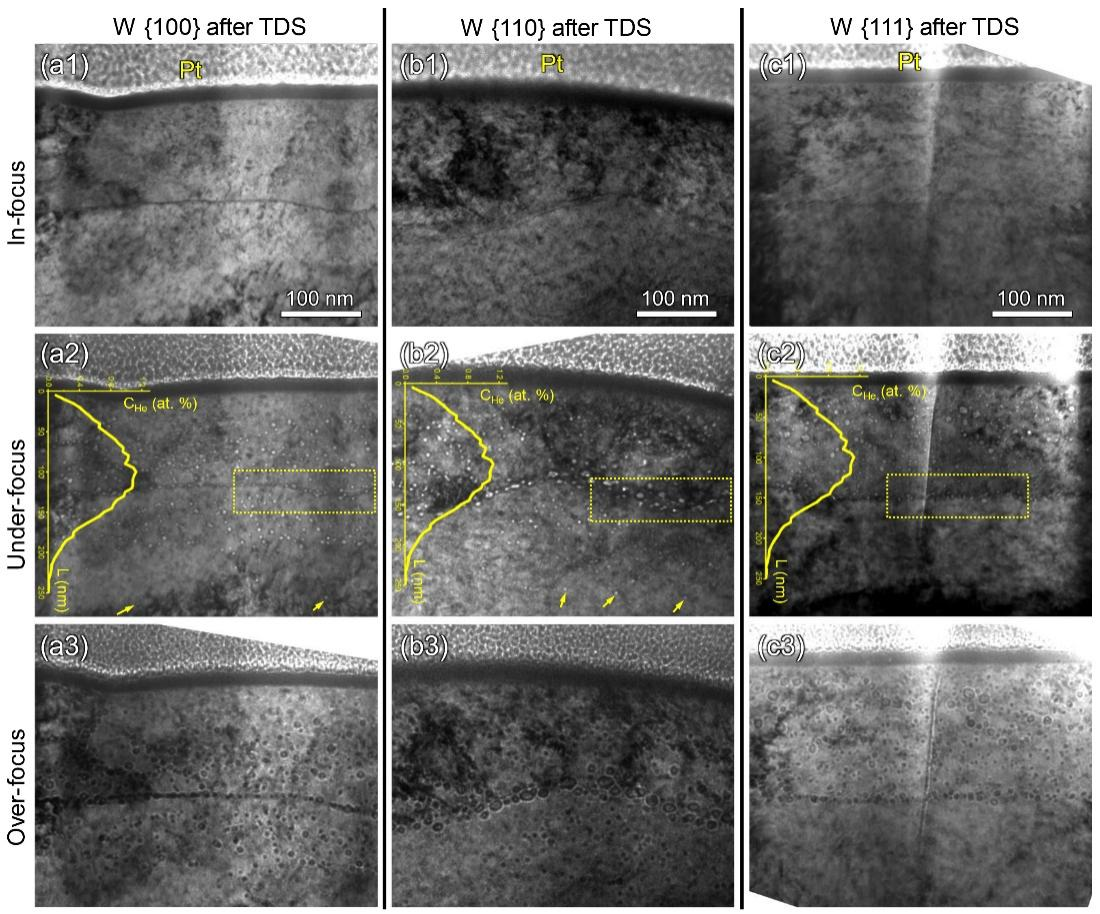 图4. 受辐照单晶钨样品在热脱附实验后的透射电镜图片。(a1-a3)和(b1-b3)W {100} 和 W {110} 的褶皱表面形貌、内部的辐照诱导晶界与氦泡。(c1-c3)W {111} 的平直表面以及内部氦泡。