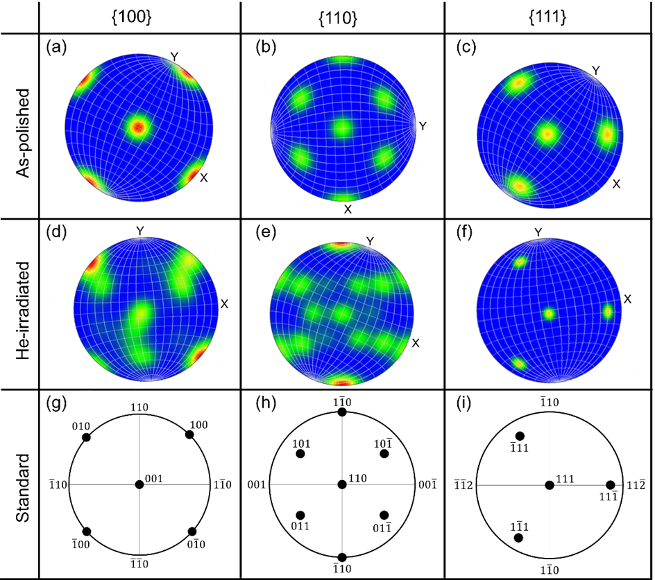 图3. 表面晶粒取向的扫描电镜极图分析。(a-c)辐照前的极图。(d-f)辐照后的极图。(g-i)标准极图。