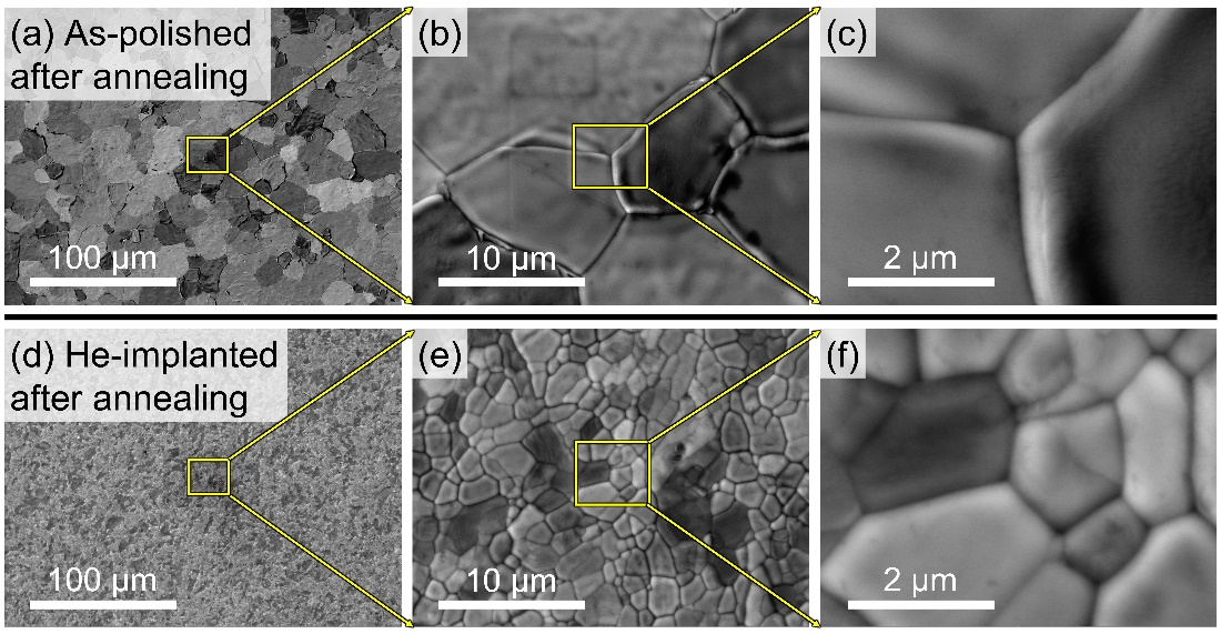 图5. 热轧多晶钨样品在热脱附实验后的表面晶粒形貌。(a-c)没有氦离子注入的样品表面。(d-f)有氦离子注入的样品表面。