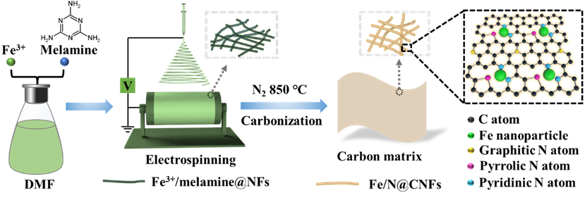 图 1 制备氮掺杂碳纳米纤维锚定铁纳米颗粒的示意图。