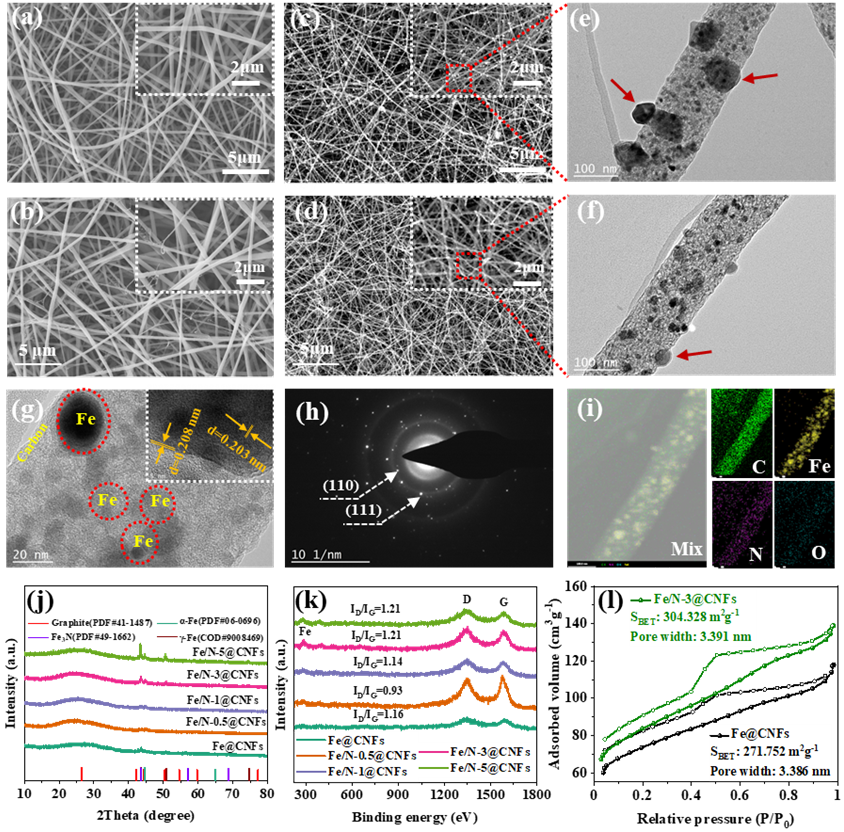 图2 (a) Fe@NFs, (b) Fe/N-3@NFs, (c) Fe@CNFs和(d) Fe/N-3@CNFs的SEM图,(e) Fe@CNFs和(f) Fe/N-3@CNFs的TEM图,(g) Fe/N-3@CNFs的HRTEM图,(h) SAED, (i) Fe/N-3@CNFs的EDS元素映射图,(j) XRD谱图,(k) Raman谱图,(l) N2吸附/脱附等温线。