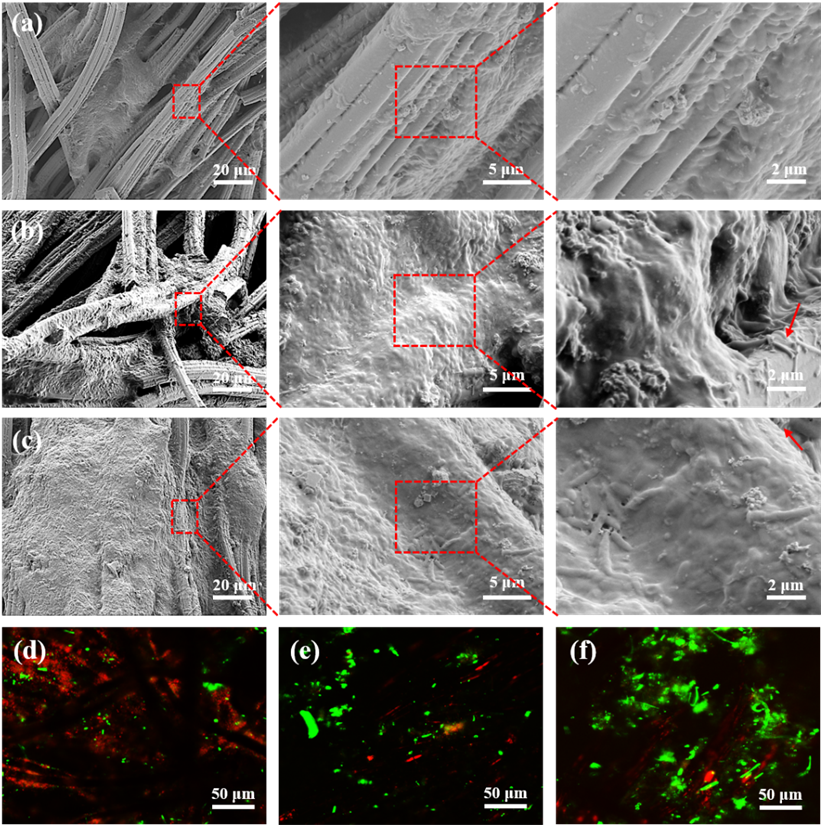 图4 (a) CC, (b) Fe@CNFs和(c) Fe/N-3@CNFs阳极上生物膜的微观形貌。 (d) CC, (e) Fe@CNFs和(f) Fe/N-3@CNFs阳极上生物膜活性分析。