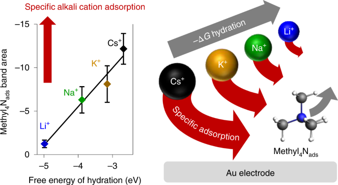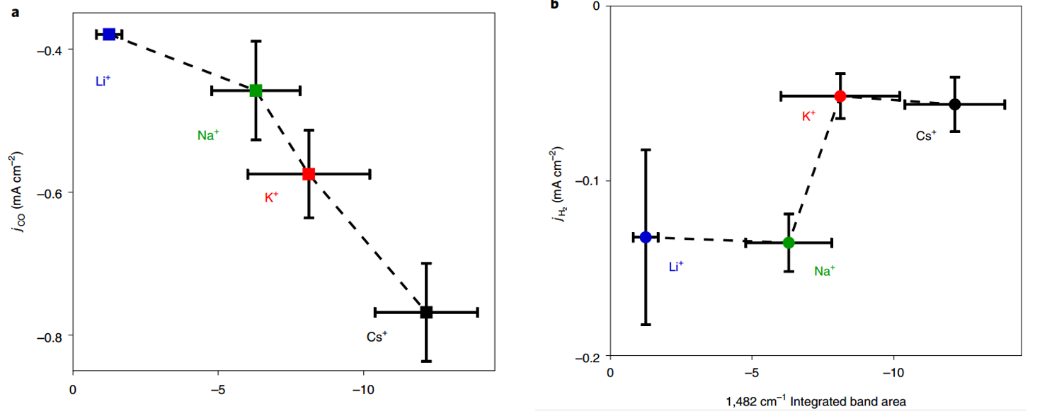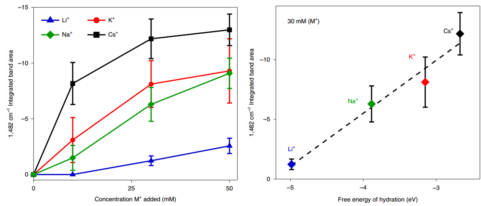 图5-6. 在1,482 cm-1带的面积随块体碱金属阳离子浓度的变化(图5,左)。1,482 cm−1波段面积与碱金属阳离子水合自由能的相关性(图6,右)。© (2022) Nature Catalysis