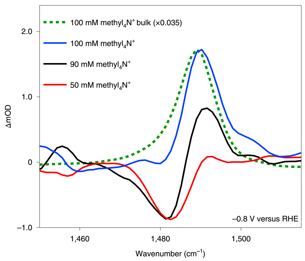 图2. 不同电解质条件下四甲基铵的CH3变形带比较。© 2022 Springer Nature Limited
