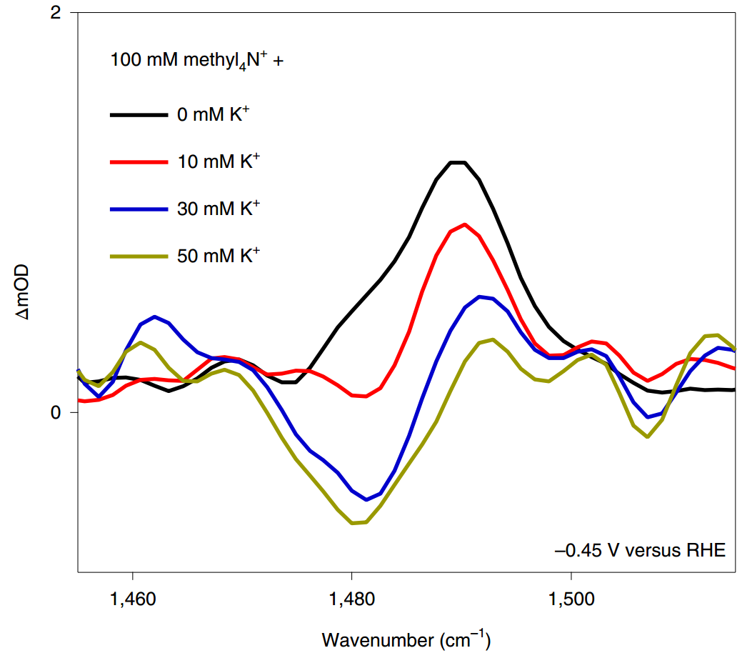 为了进一步证实吸附态K取代吸附态四甲基铵的结论,图4中,保持电极电位为-0.45 V,作者研究了在100 mM四甲基碳酸氢铵电解质中添加K+的影响。在电解质组合物中的-0.45 V处收集单束样品光谱,在所有没有K+情况下,单光束参考光谱是100 mM四甲基铵中+0.2 V界面的光谱。在没有K+的情况下,水合四甲基铵仅在~1,490 cm-1处出现正向峰。这些实验表明,吸附态K对吸附态四甲基铵的置换是负向带产生的原因,即~1,482 cm-1的带是吸附态K对应的光谱测量。
