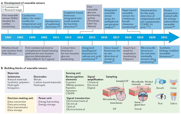 图1.可穿戴传感器发展里程碑及其主要构件概览。© 2022 Springer Nature Limited