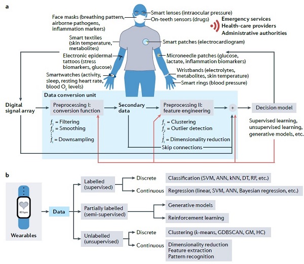 (a)数据流水线的概念化。可穿戴器件与传感策略的组合和处理可获得生理参数和生物标志物。其中,黑线和红线分别表示数据处理和模型训练路径;