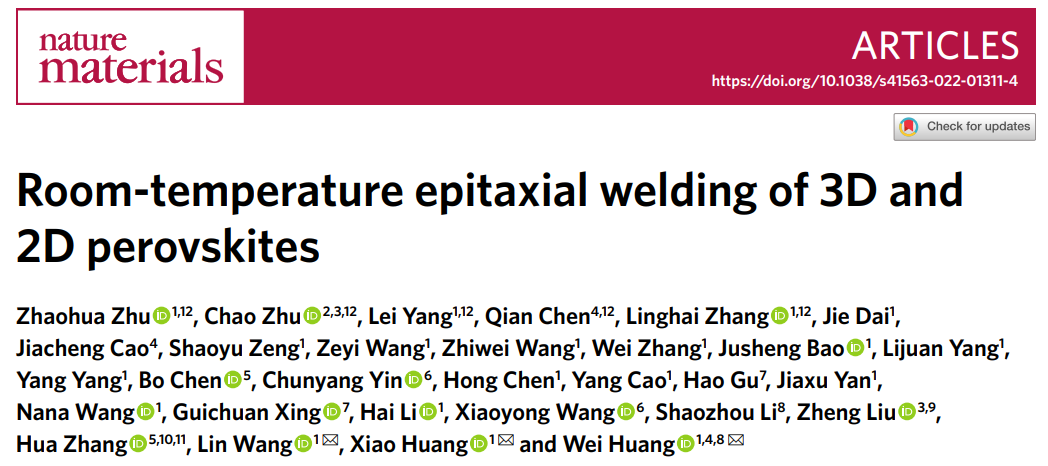 - Zhu; C. Zhu; L. Yang; Q. Chen; L. Zhang; J. Dai; J. Cao; S. Zeng; Z. Wang; Z. Wang; W. Zhang; J. Bao; L. Yang; Y. Yang; B. Chen; C. Yin; H. Chen; Y. Cao; H. Gu; J. Yan; N. Wang; G. Xing; H. Li; X. Wang; S. Li; Z. Liu; H. Zhang; L. Wang*; X. Huang*; W. Huang*, “Room-temperature epitaxial welding of 3D and 2D perovskites,” Nat. Mater., 2022, DOI: 10.1038/s41563-022-01311-4.