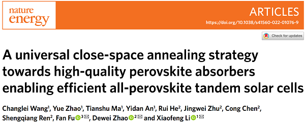 文献链接:A universal close-space annealing strategy towards high-quality perovskite absorbers enabling efficient all-perovskite tandem solar cells (Nat. Energy 2022, DOI: 10.1038/s41560-022-01076-9)
