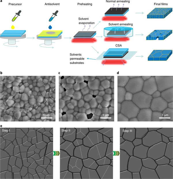 (b-d)采用常规退火、溶剂退火和CSA工艺制备的锡铅混合窄带隙钙钛矿薄膜的SEM形貌图。