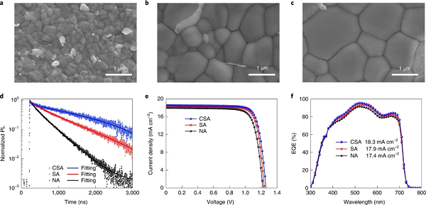 (a-c)常规退火、溶剂退火和CSA工艺制备的宽带隙钙钛矿薄膜的SEM形貌图。