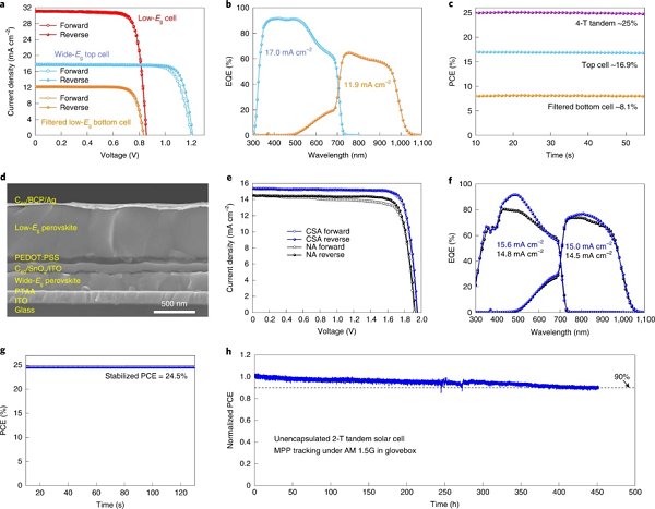2、该策略制备的单结宽、窄带隙钙钛矿电池的效率分别达到18.58%和21.51%,从而使得4-T和2-T全钙钛矿叠层太阳能电池效率分别达到为25.15%和25.05%。