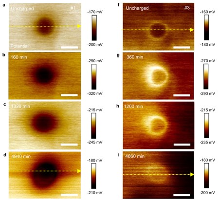 图2. 氢–纳米析出相相互作用的原位扫描开尔文探针力显微镜(SKPFM)表征。a-d&f-i 在未充氢和充氢后不同时间测量的纳米相1#和3#的电势图;e 沿图a,d中黄色虚线的电势分布;j 沿图f,i中黄色虚线的电势分布。图中所有比例尺为200 nm。注:纳米相周围的暗环和亮环分别表明了其捕获氢和排斥氢的行为。