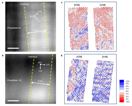 图 6. 纳米相边界附近的原子应变图。a, b 纳米相界面处马氏体原子级 HAADF-STEM图像。黄色虚线标记了原子应变分析的区域。c, d 距离界面 3 nm 范围内区域的原子应变图。e, f 密度函数理论 (DFT) 计算 H 原子在四面体间隙位置的溶解能和四面体间隙体积。
