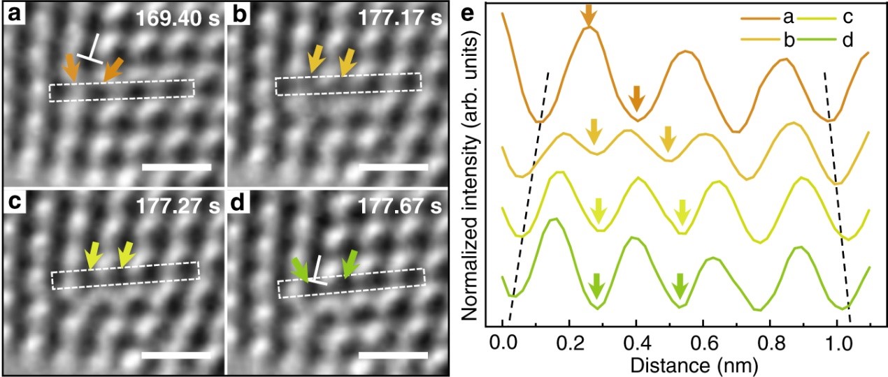 图4 负向攀移过程中位错心的重构;a-d一系列显示重建过程的HRTEM图像。比例尺:0.5 nm. e. a-d图中沿点矩形提取的对应对比度强度轮廓. © 2022 Nature communications
