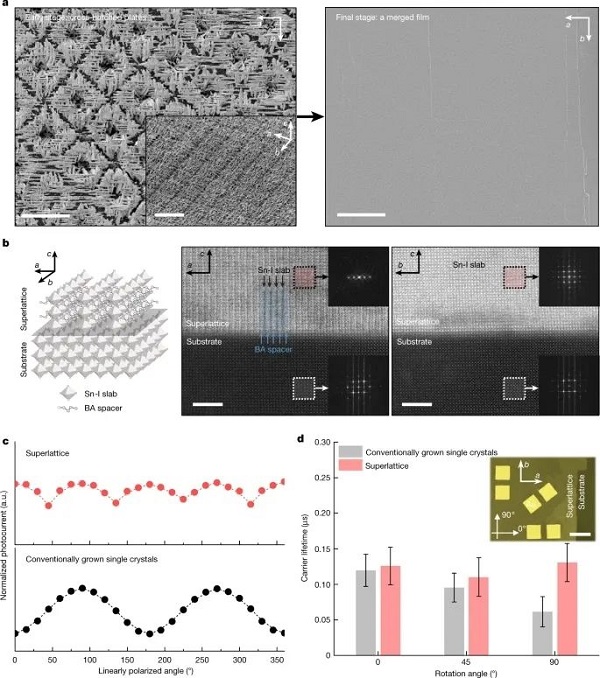 近日,加州大学圣地亚哥分校徐升教授团队在知名期刊Nature上以题为“Perovskite superlattices with efficient carrier dynamics”发表了钙钛矿超晶格领域的重大进展。研究团队通过化学外延法制备了一种低维金属卤化物钙钛矿BA2MAn−1SnnI3n+1(BA,丁基铵;MA,甲基铵;n = 1,3, 5)超晶格。无机板垂直于基底排列,并以平行于衬底的纵横交错的2D网络互连,从而在三维空间中实现高效的载流子传输。晶格失配基底压缩有机隔绝层,大大削弱了量子限制。制备的超晶格太阳能电池的性能已在准稳态下得到验证,显示出稳定的12.36%光电转换效率。此外,带内激子弛豫过程可能产生异常高的VOC。
