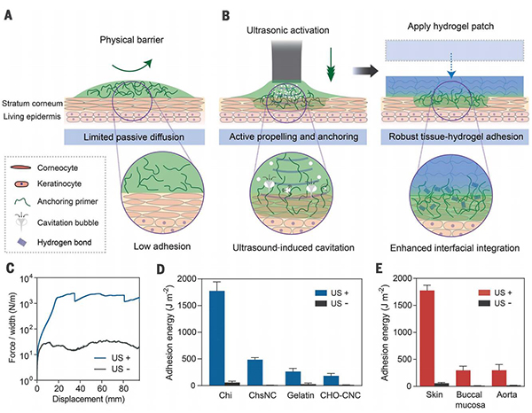 今日,加拿大麦吉尔大学李剑宇教授和瑞士苏黎世联邦理工学院Outi Supponen等人(共同通讯作者)设计了一种由聚丙烯酰胺或聚(N-异丙基丙烯酰胺)与藻酸盐结合制成的水凝胶,且使用含有壳聚糖、明胶或纤维素纳米晶体纳米颗粒的溶液进行涂底。其中,将超声波(US)介导的策略引入文章,实现具有可控和抗疲劳性的强生物粘结剂(生物胶水)的制备。研究表明,在不发生化学反应的情况下,US可以将水凝胶与猪皮肤之间的粘附能和界面疲劳阈值放大高达100和10倍。同时,结合实验和理论模型表明,关键在于US诱导的空化,它将锚定引物推进并固定到组织中,从而减轻屏障效应。本文的策略实现了强生物粘附、按需分离和透皮给药的空间模式。这项工作扩展了坚韧生物粘附的材料库,并实现了具有高度可控性的生物粘附技术。